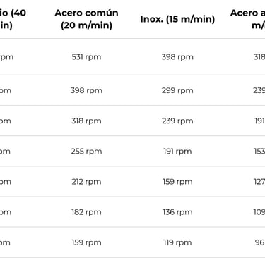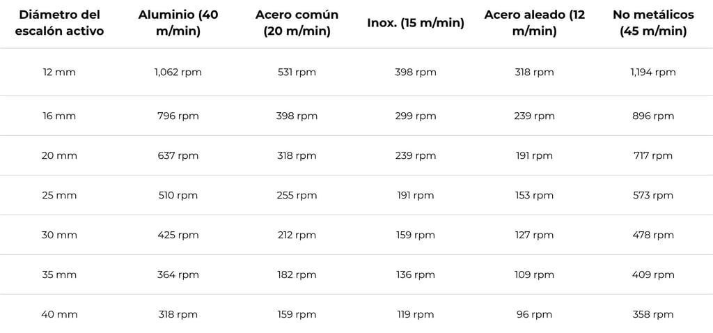 La broca escalonada siempre opera al diámetro activo — el escalón que está cortando en ese momento. Las RPM deben ajustarse al diámetro del escalón en uso, no al diámetro total de la broca. Seleccione la velocidad según el material y el escalón activo.