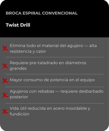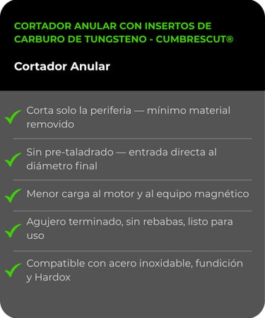 A diferencia de una broca espiral que elimina todo el material del agujero, el cortador anular solo corta la periferia y deja un núcleo sólido intacto. Esto reduce hasta un 80% del material a remover, genera menos calor, exige menos potencia al equipo y produce el agujero hasta cuatro veces más rápido con mejor acabado superficial.