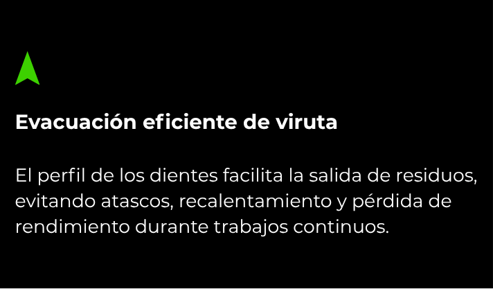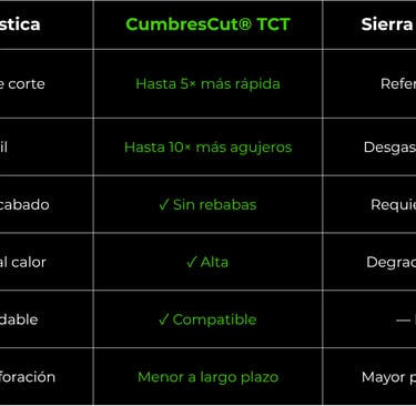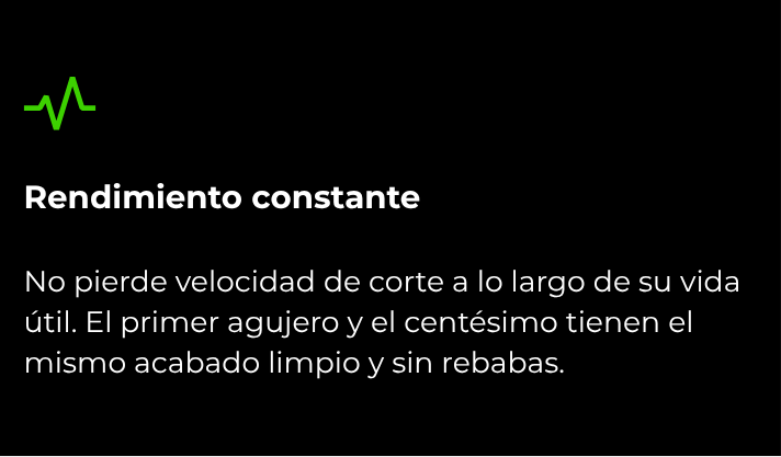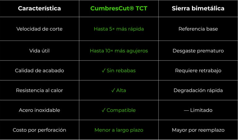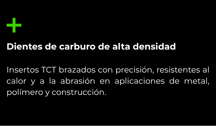 El carburo de tungsteno es uno de los materiales más duros en herramientas de corte industriales. A diferencia del bimetálico, que cede ante el calor y la abrasión, los dientes TCT mantienen su filo bajo trabajo continuo y en materiales donde otras herramientas simplemente se desgastan.
