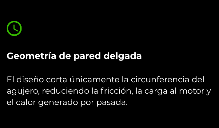 En metales duros, baje las RPM. La velocidad excesiva "quema" el diente de carburo y anula su dureza. En materiales blandos (PVC, tablaroca), puede trabajar a mayor velocidad.
